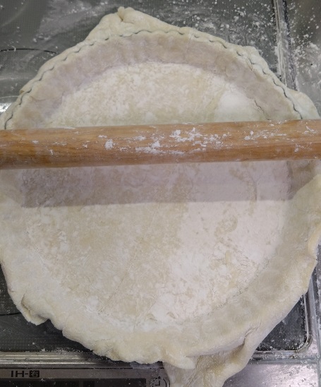 ①冷凍パイシートは常温で戻し、打ち粉をした上に真ん中を少し重ねておき、めん棒でタルト型の大きさに伸ばす