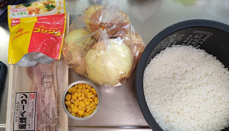 ④きざんだベーコン、水をきったコーン、玉ねぎをのせたら炊飯スタート
