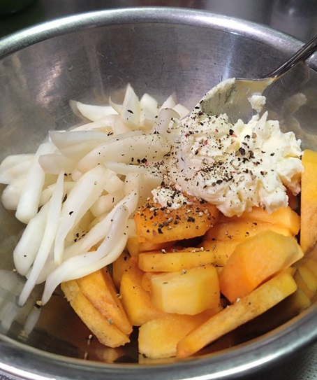 ③蕪は軽く絞り、柿、クリームチーズソース、黒胡椒を加えて、軽く混ぜ合わせたら出来上がりです