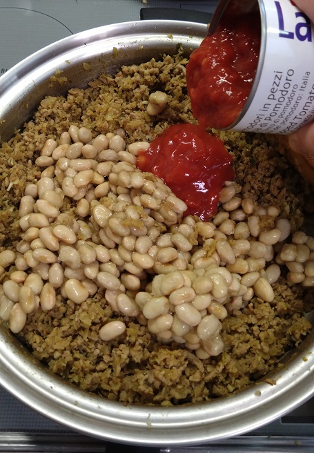 ④水煮大豆・トマト缶を加えて煮詰め、塩・胡椒で味を整える