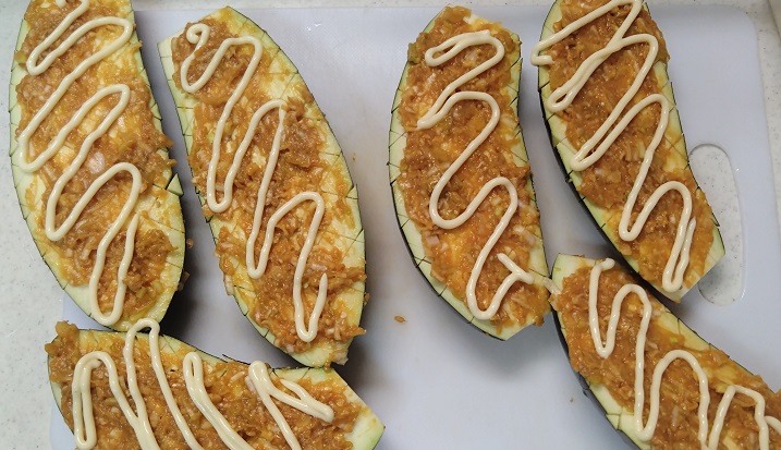 ③茄子の表面に葱味噌を塗り、マヨネーズを少しトッピングして、茄子が柔らかくなるまでグリルで焼く