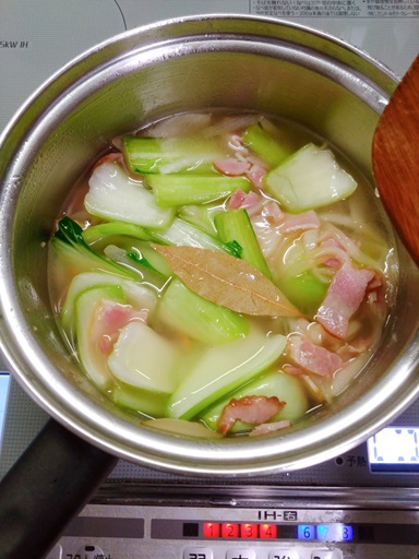 ②青梗菜の硬い部分を加え、ひたひたの水、ローリエ、コンソメを加え煮る