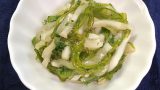 ②青梗菜の硬い部分を加え、ひたひたの水、ローリエ、コンソメを加え煮る