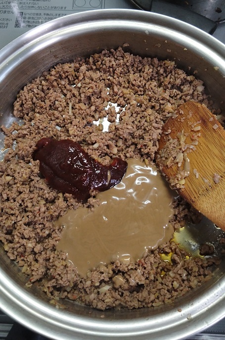 ②挽肉を加えて火が通るまで炒めたら、豆板醤(辛いの苦手な方は少なめに)を加えて軽く炒めます。